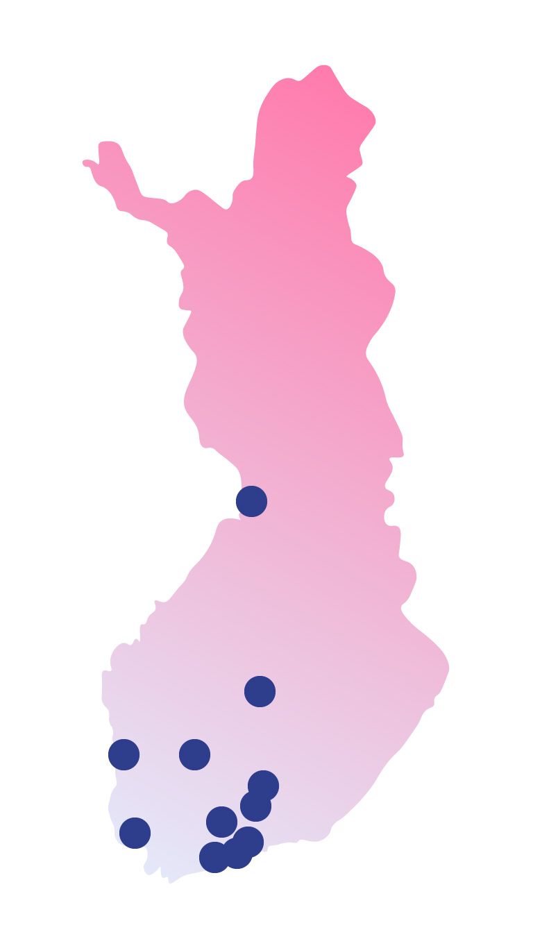 Espoo » Helsinki » Vantaa » Lahti » Hämeenlinna » Tampere » Jyväskylä » Turku » Pori » Oulu » Vihti »